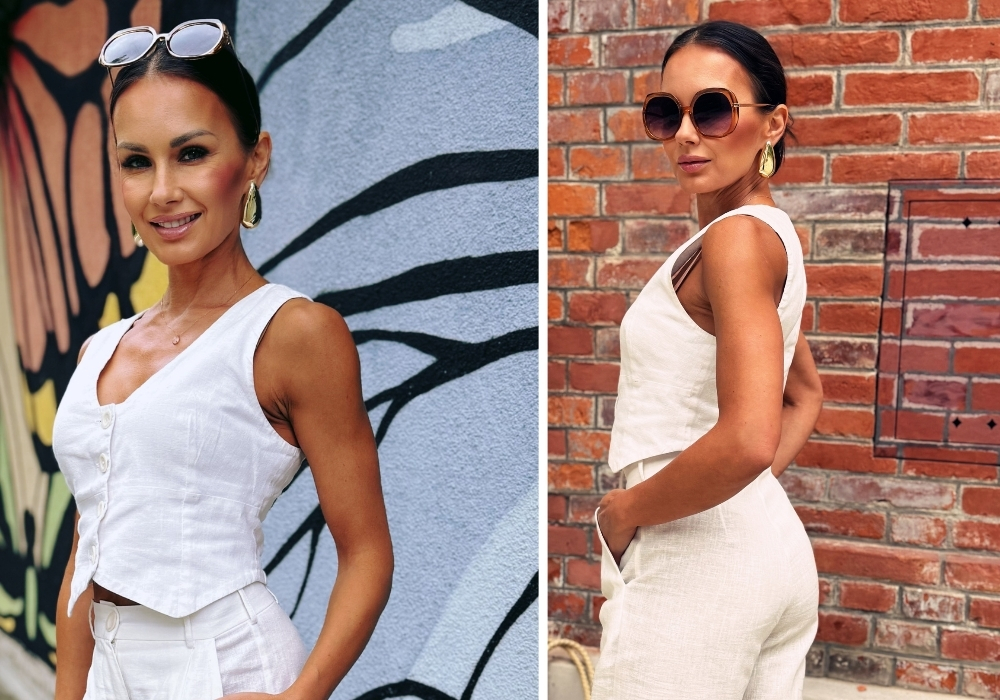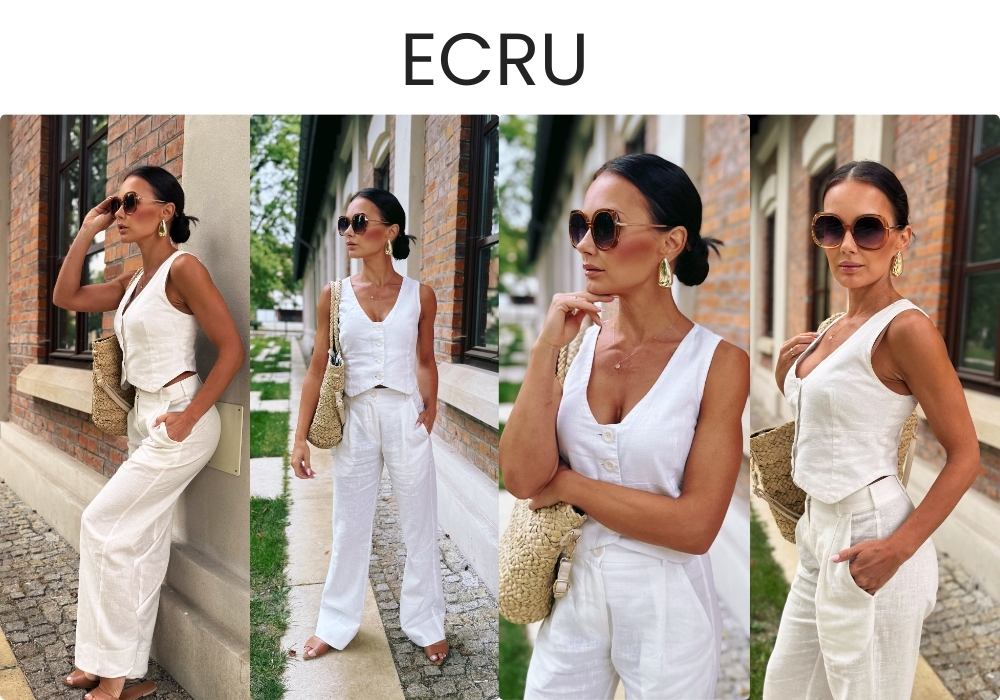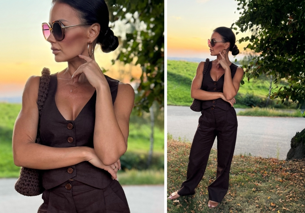 - Linen pants and vest are the base for many looks: