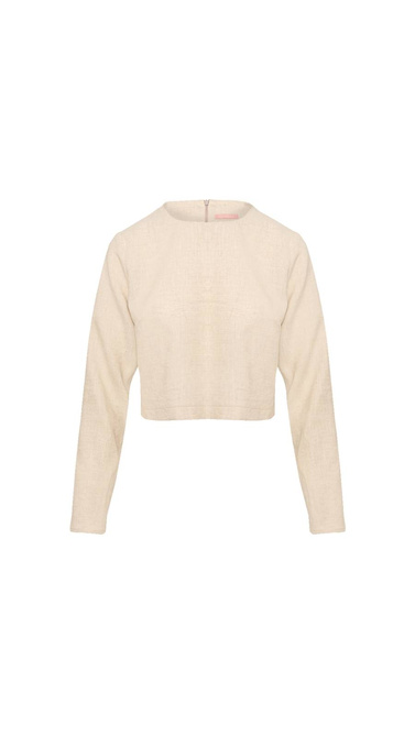 - Natural linen fabric, short cut, chest darts, covered zipper, long sleeve.